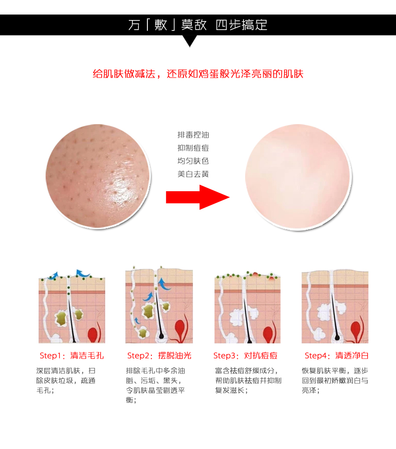 • 功效: 美白 補(bǔ)水 保濕 抗痘 收縮毛孔 提亮膚色 排毒 分解黑色素 祛痘 祛痘印